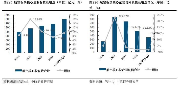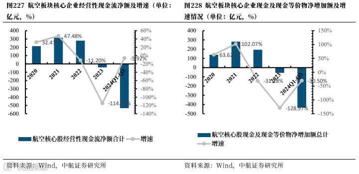 ③三季报反馈现金流情况较差,企业面临“手头紧”困境:航空板块核心企业2024年前三季度经营性现金流净额规模达到(-532.75亿元,-5.92%),经营性现金流出现大幅流出情况。现金及现金等价物净增加额(-434.44亿元,-30.50%),企业账面资金大幅减少。由此看出,整体航空板块企业面临“手头紧”局面,可能造成企业资金周转困难、偿债压力增大、限制投资等一系列问题,特别是民营企业普遍规模较小,承受风险能力远不如大型央企,或面临资金链断裂问题。