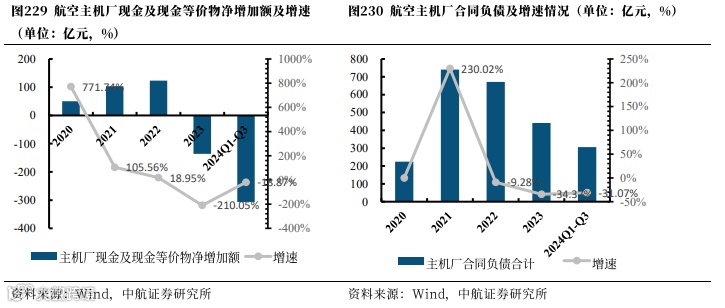 从财务数据来看,航空主机厂整体2024年前三季度经营情况承压,盈利能力出现下降,从合同负债(306.24亿元,-31.07%),现金及现金等价物净增加额(-306.20亿元,-18.87%)两项指标可以看出当前航空主机厂整体需求低迷,现金流紧张,企业经营压力较大。作为产业链下游的终端总装厂,航空主机厂的经营情况是产业链整体情况的“晴雨表”,当前产业面临一定困境,但我们认为当前我国航空产业仍处于高速发展时期,待后续方向明确后,航空产业经营情况有望在2025“十四五”收官之年迎来复苏,并于“十五五”开启新的高景气增长周期。