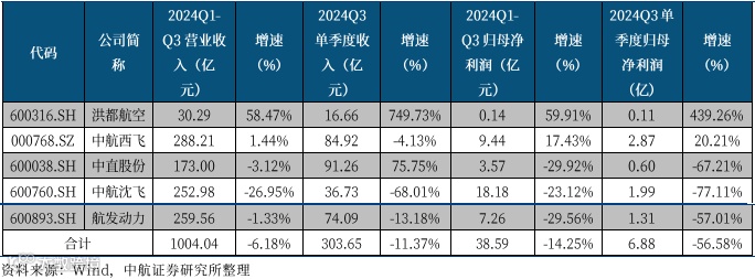 2024年前三季度航空主机厂(除无人机)实现营业收入(1004.04亿元,-6.18%),归母净利润(38.59亿元,-14.25%),经营情况出现小幅下滑。其中仅有洪都航空、中航西飞营业收入与归母净利润同比提升,洪都航空提升明显。中直股份、中航沈飞、航发动力归母净利润均出现明显下滑。