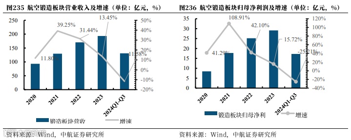 2024年前三季度,航空锻造环节实现营业收入(131.05亿元,-11.58%),归母净利润(17.23亿元,-25.21%)。2024年Q3单季度航空锻造环节实现营业收入(36.70亿元,-20.63%),归母净利润(3.73亿元,-43.30%)。整体营收、利润双双下滑,其中三季度影响更为明显。航空锻造类企业产能在2023年进入爬坡阶段,叠加随着国际民航市场恢复,航空发动机锻造国际转包类业务增速提升较为明显,进入2024年,降价以及订单不确定性对于上游的影响更为明显,锻造类企业与零部件加工企业对是订单敏感型企业,在一系列的产能建设提升后,若缺少订单需求则面临设备空转压力,并且行业内多为民营企业,抗风险能力较弱,需进一步提升管理能力,优化成本,加强核心竞争力抵抗风险,静待需求端改善。