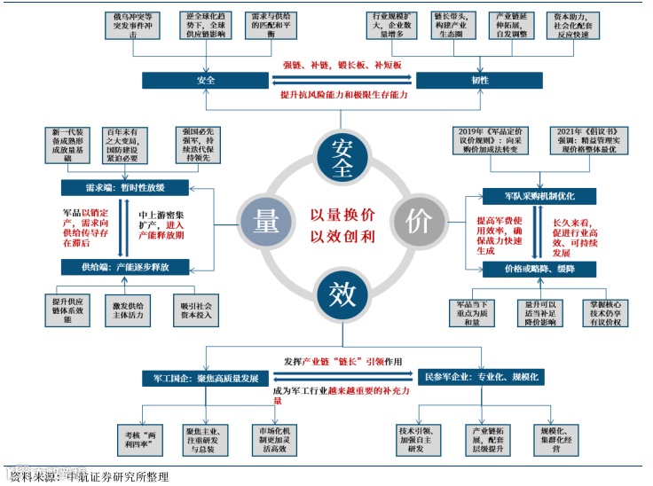 2024年,随着部分航空核心环节产能释放,各企业的供给能力得到了显著的提升。然而经历了“十四五”阶段的中期调整,军工行业已步入小周期一年有余,订单需求节奏不明朗直接导致了当前供给端呈现出“巧妇难为无米之炊”的困境。同时不断严格的审价机制导致军品面临持续降价压力,在这种情况下,高质量、低成本、可持续发展将成为未来行业的主旋律,价格、质量再次成为核心关注点,“以量换价”成为大势所趋,“以效创利”则成为成熟配套企业核心竞争力的重要体现。