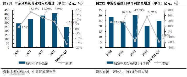 2024年三季度,航空中游分系统实现营业收入(75.52亿元,-23.00%),归母净利润(5.25亿元,-39.09%),经营情况进一步下滑。