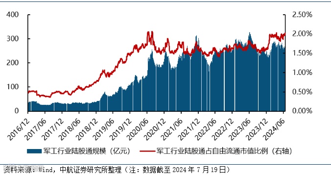 本周,北向资金累计净流出193.23亿元。军工行业陆股通占自由流通市值比例为2.02%,较7月12日环比上升0.03个百分点。