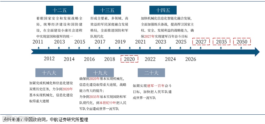 国防建设目标重要节点,对军工行业具有重要的正向影响。在五年计划之外,军工行业收入增速会受到我国设立的多个国防建设目标时间节点的计划性影响。在各个国民经济和社会发展五年规划纲要,以及第十八次、第十九次以及第二十次全国代表大会(以下简称“十八大”、“十九大”以及“二十大”)报告中,明确提出过四个关于国防建设的时间目标节点。即2020年基本实现机械化,信息化建设取得重大进展,战略能力有大的提升;2027年如期实现建军百年奋斗目标;2035年基本实现国防和军队现代化;2050年把人民军队全面建成世界一流军队。