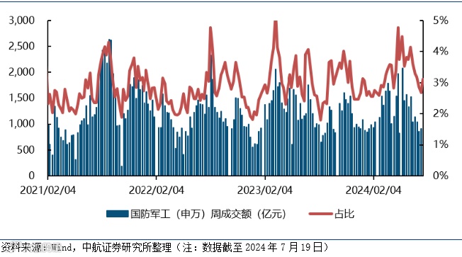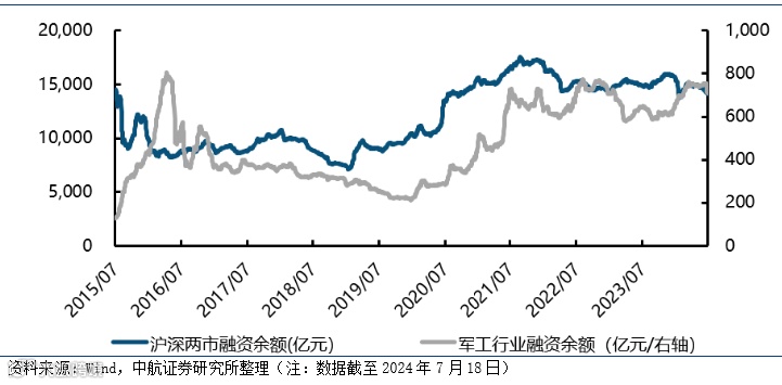 截至2024年7月18日,军工行业的融资余额合计709.95亿元,比上周环比下降5.70%,占两市融资余额比例为5.02%。