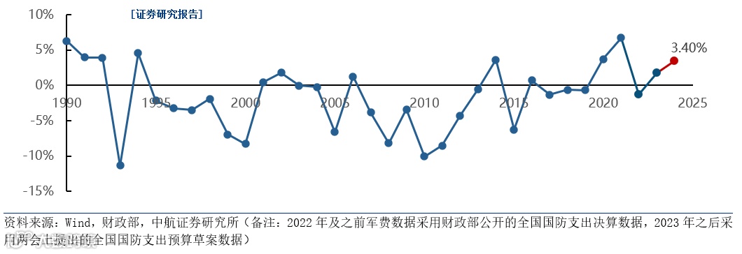 从财政支持力度来看,2024年中央政府对国防投入的支持力度再次回升。军费增速与公共财政支出增速的差值一定程度可反映出我国政府对国防建设的支持力度,即“财政支出越少,军费投入越多,则说明国防建设投入力度越大”,在2022年该差值一度跌至-1.3%后,2023年回升至1.8%,2024年则再度提升至3.4%。