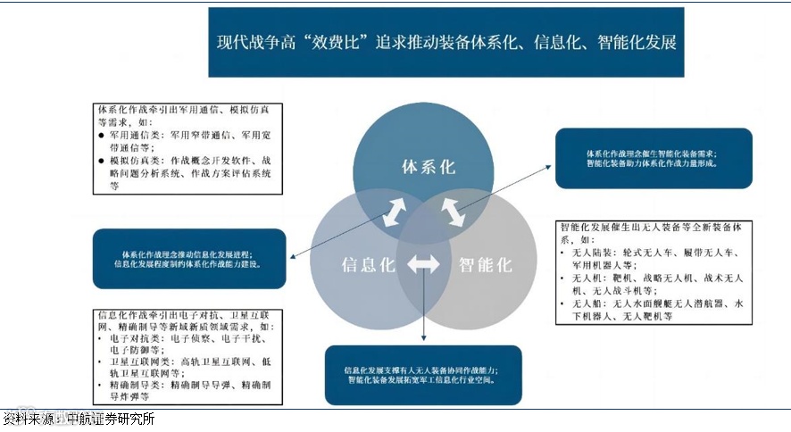 可以预见的是,伴随智能化技术的发展进步,无人装备,尤其是小型无人装备的协同作战能力、正面战场杀伤能力将进一步提升,届时智能、无人化装备有望成为各国军队的“刚需”,为军工行业带来新的发展机遇。同时,信息安全、电子对抗技术与军用卫星互联网为代表的信息化技术是解决战时通信、网络攻击、情报支援、侦察、反侦察的重中之重。当前,武器装备信息化已是国际共识之一,世界多国已经将新式装备信息化水平作为考核装备性能的核心指标,同时多国正在实施的传统武器装备信息化改装也是这一共识的外在表象。现代战争已经从传统的单一军种、单一平台间的竞争转为一个体系与另一体系的竞争,为适应装备体系化作战运用需求,需要创立体系化装备论证、体系化装备研制、体系化装备列装、体系化形成作战能力的装备建设发展模式。