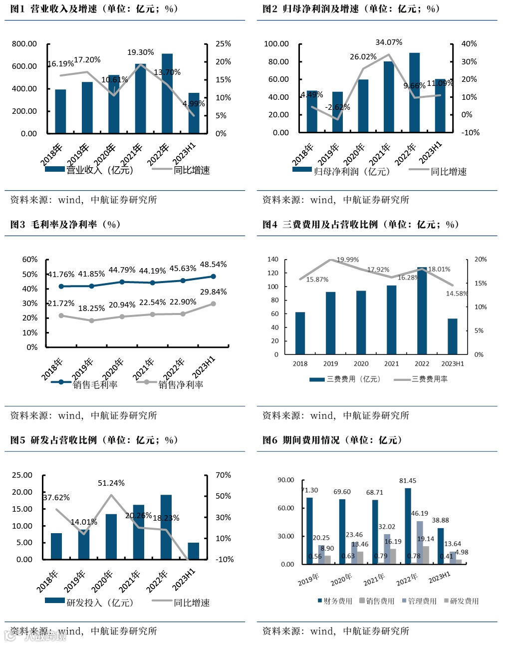 公司8月31日公告,2023H1实现营收(362.98亿元,+4.99%),归母净利润(60.42亿元,+11.09%),毛利率(48.54%,-2.06pcts),净利率(29.84%,+1.39pcts)。2023Q2实现营收(184.04亿元,同比+5.33%,环比+2.85%),归母净利润(30.19亿元,同比+18.25%,环比-0.13%),毛利率(47.27%,同比-2.51pcts,环比-2.58pcts),净利率(29.48%,同比+3.88pcts,环比-0.72pcts)。