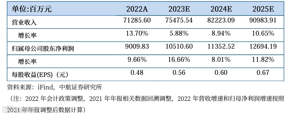 基于以上观点,我们预计公司2023-2025年的营业收入分别为754.76亿元、822.23亿元、909.84亿元,归母净利润分别为105.11亿元、113.53亿元126.94亿元,EPS分别为0.56元、0.60元、0.67元,首次覆盖给予“买入”评级,2023年9月5日收盘价7.28元,对应2023-2025年PE分别为13.00倍、12.13倍、10.87倍。