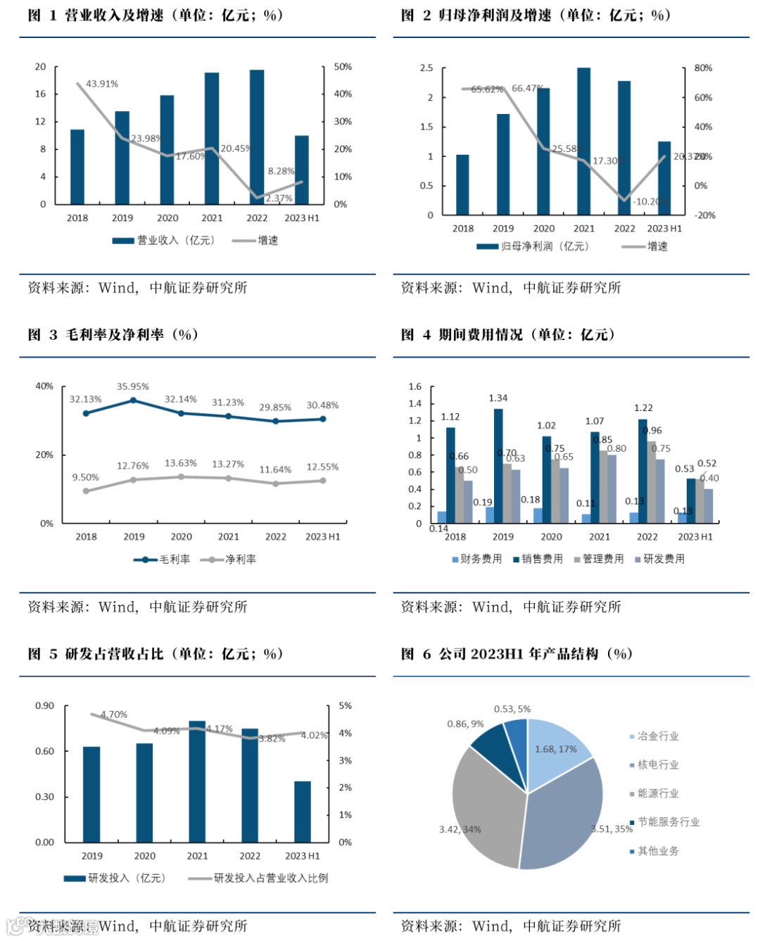 公司2023H1营业收入(9.99亿元,+8.28%)和归母净利润(1.25亿元,+20.37%)增速较去年同期均实现扭负为正;毛利率(30.48%,+2.15pcts)和净利率(12.55%,+1.26pcts)均有所提高,毛利率提高主要系高毛利的核电产品业务占比与毛利率均有所提高。单看2023Q2,公司实现营收5.02亿元(同比+22.03%,环比+1.07%),归母净利润0.49亿元(同比+62.72%,环比-34.94%)同比有较大幅度的提升,毛利率30.50%(同比+2.41pcts,环比+0.05pcts),净利率9.84%(同比+2.46pcts,环比-5.44pcts)环比有所下降。2023H1分应用领域来看: