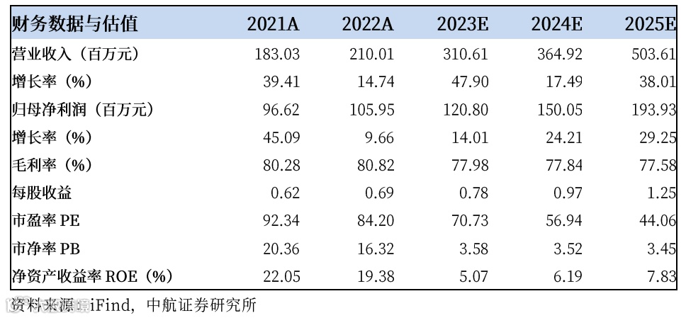我们预计公司2023-2025年的营业收入分别为3.11亿元、3.65亿元和5.04亿元,归母净利润分别为1.21亿元、1.50亿元和1.94亿元,EPS分别为0.78元、0.97元和1.25元,我们给予“买入”评级。