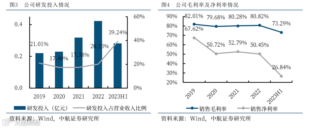2023H1公司营收(0.72亿元,+52.91%)及归母净利润(0.19亿元,+6.01%)创下新高,归母净利润相比营收增速较低主要系2023H1结转的政府补助(487.08万元,-65.60%)同比减少所致,剔除政府补助等因素影响后,扣非净利润(0.17亿元,+123.35%)增长明显,反映公司盈利能力有所提升。公司毛利率(73.29%,-3.88pcts)有所下降,我们认为主要是公司产品结构变动所致。公司净利率(26.84%,-11.88pcts)同比下降。单看2023Q2,公司实现营收(0.37亿元,同比+84.33%,环比+5.71%),归母净利润(0.11亿元,同比-1.54%,环比+28.42%),毛利率(66.22%,同比-8.48pcts,环比-14.53pcts),净利率(29.40%,同比-25.62pcts,环比+5.25pcts),总体来看营收及业绩环比有所提升。