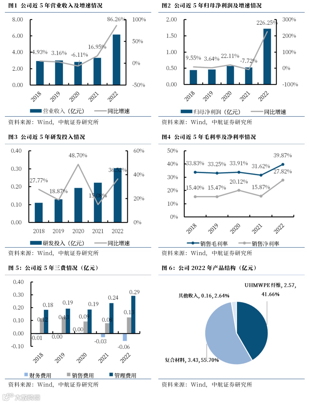 1、UHMWPE纤维:2022年收入(2.57亿元,+14.54%)稳定增长,收入占比(41.66%,-26.09pcts)快速下降,主要是复材业务的扩张导致,产量(3754.10吨,+10.21%)增加,销量(2843.31吨,-4.86%)略降,受益于价格(9.03万元/吨)的增长,毛利率(36.58%+7.11pcts)得到了大幅提高。