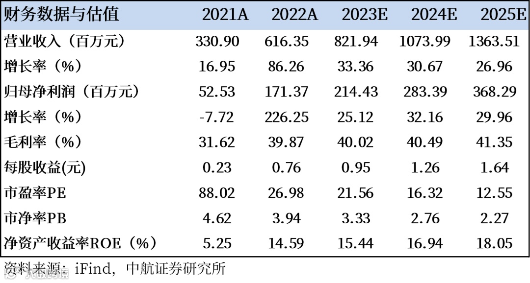 我们预计公司2023-2025年的营业收入分别为8.22亿元、10.74亿元和13.64亿元,归母净利润分别为2.14亿元、2.83亿元和3.68亿元,EPS分别为0.95元、1.26元和1.64元,我们给予“买入”评级,目标价27元,对应2023-2025年预测EPS的28倍、21倍及16倍PE。