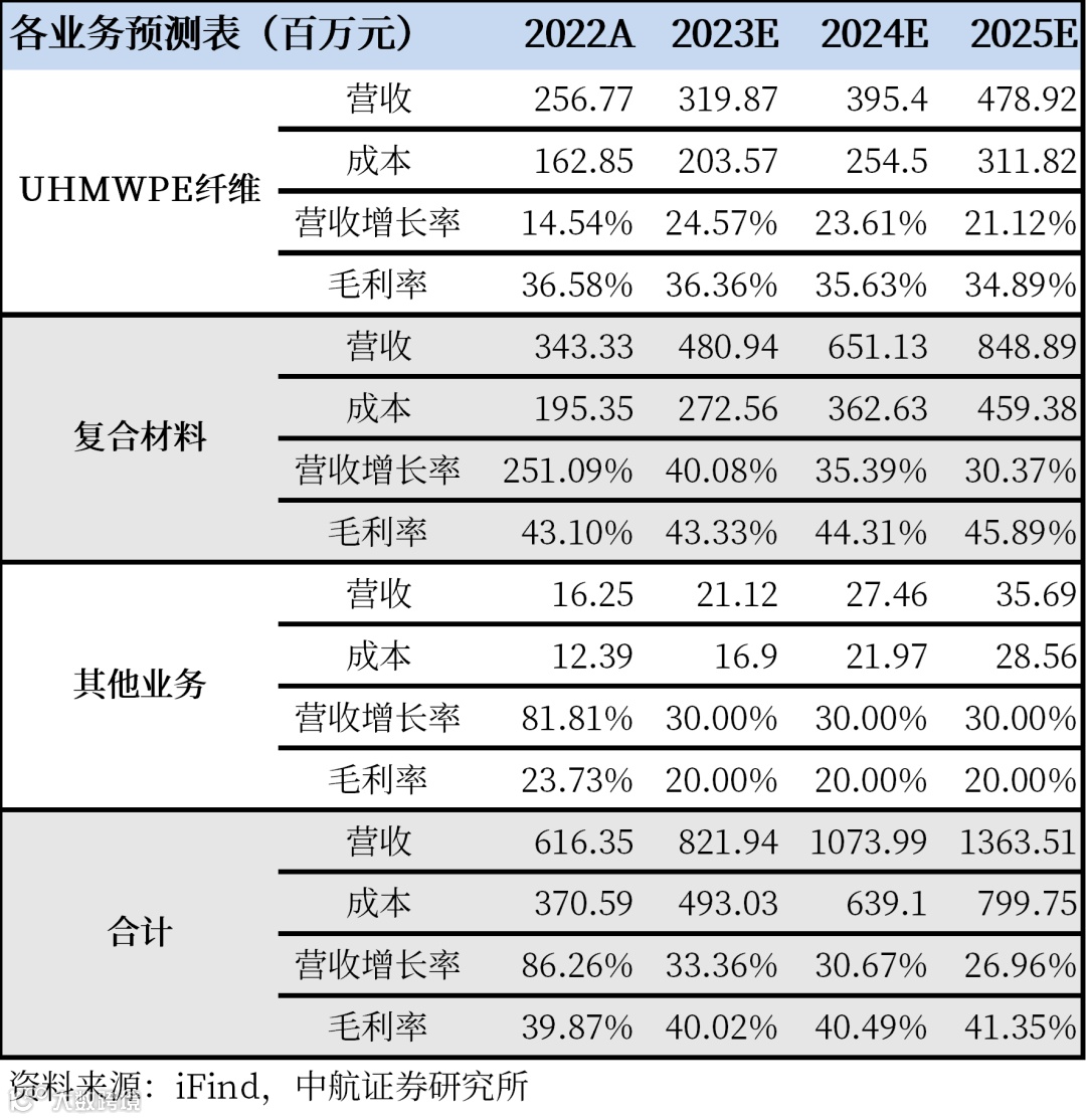 纤维方面,2022年产能为3320吨,山东二期2240吨产能正在建设,预计2023年底完成建设并部分投产。此外,公司以1.8亿元增资持有优和博新材料70%股权,优和博已取得年产3000吨UHMWPE纤维的建设手续,一期千吨产能已达产,二期千吨产能预计2023上半年投产,随后预计开始建设三期千吨产能。随着“内外”产能的全部落地,预计公司将形成8560吨的UHMWPE纤维年产能;复合材料方面,2022年无纬布产能达到800吨,正在建设的2000吨产能预计2023年底将陆续释放,防弹制品产能落地后,防弹板增加50万块,头盔增加18万顶。