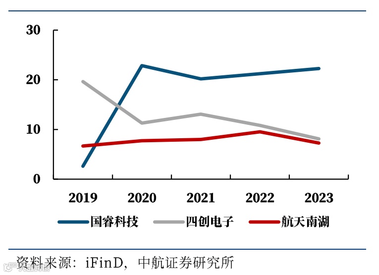 另外,我们选取上市公司国睿科技和四创电子作为可比公司,并将两家公司的雷达相关产品业务的营收和毛利率与公司进行对比,如下图所示,可以看出公司较其他两家可比公司收入规模相对较小,但毛利率情况较好。公司近年来毛利率波动较大的原因主要系军品差价、产品结构变化以及各类产品毛利率自身波动所致。
