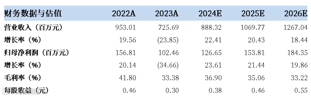基于以上观点,我们预计公司2024-2026年的营业收入分别为8.88亿元、10.70亿元和12.67亿元,归母净利润分别为1.26亿元、1.53亿元及1.84亿元,EPS分别为0.38元、0.46元、0.55元,我们给予买入评级,目标价为22.00元,分别对应59倍、48倍及40倍PE。