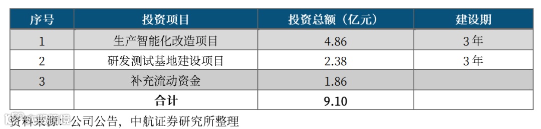 公司于2023年5月在科创板上市,发行价为21.17元/股,募集资金总额为17.85亿元。公司拟使用募集资金开展项目建设,拟投入4.86亿元用于生产智能化改造项目,2.38亿元用于研发测试基地建设项目,1.86亿元用于补充流动资金。如下表所示。