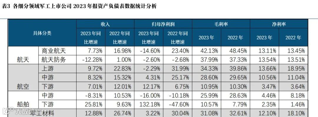 截至2024年4月30日,军工板块2023年年报已披露完毕,在224家军工板块上市公司中,104家公司2023年报归母净利润同比实现增长,120家公司2023年报归母净利润同比下降。我们分别通过对75家军品业务占比相对较高,且财务数据具有可比性的军工上市公司、以及对不同企业属性(军工央企,其他国企以及民参军企业)、细分领域(航空、航天、船舶、材料、电子)分类进行统计,可以得到几个重要表现,包括: