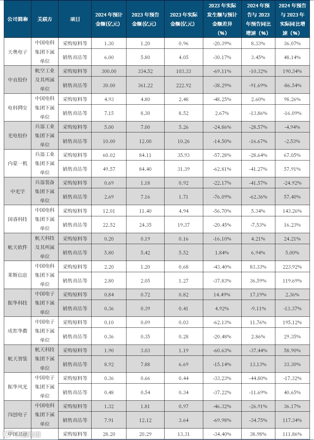 军工央企下属上市企业公告关联交易时常作为业绩预测指标,预计关联交易的增速如果与预期出现偏差,也将影响股价表现。根据我们统计的多个军工央企下属上市企业的关联采购以及关联销售数据来看,2024年,多家军工企业对其相关领域下游需求信心仍足。