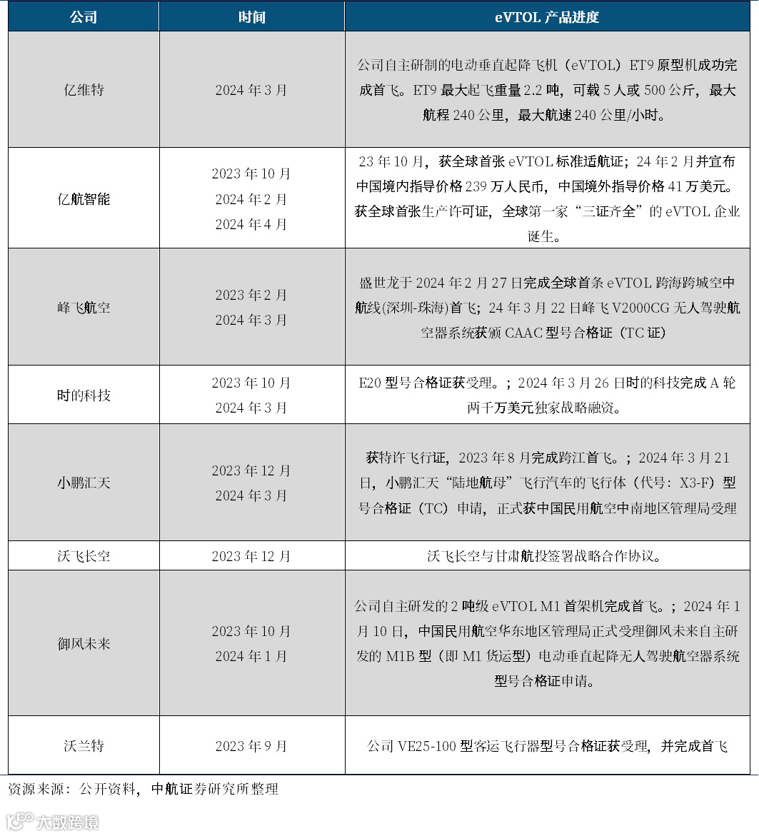2023年10月13日,亿航智能宣布,由亿航智能自主研发的EH216-S无人驾驶载人航空器系统获得中国民用航空局正式颁发的型号合格证 (Type Certificate) ,标志着EH216-S的型号设计充分符合中国民航局的安全标准与适航要求,具备了无人驾驶航空器载人商业运营的资格,这标志着全球首款载人无人驾驶航空器系统符合民航局适航要求,具备了载人商业运营的能力。2024年4月7日,亿航智能获得由中国民航局颁发的EH216-S无人驾驶载人航空器系统生产许可证(PC),这是全球eVTOL行业内首张生产许可证。这意味着亿航智能成为全球eVTOL行业内,首个集齐民用航空器适航“三大通行证”的企业,eVTOL产品正式进入规模化生产阶段。