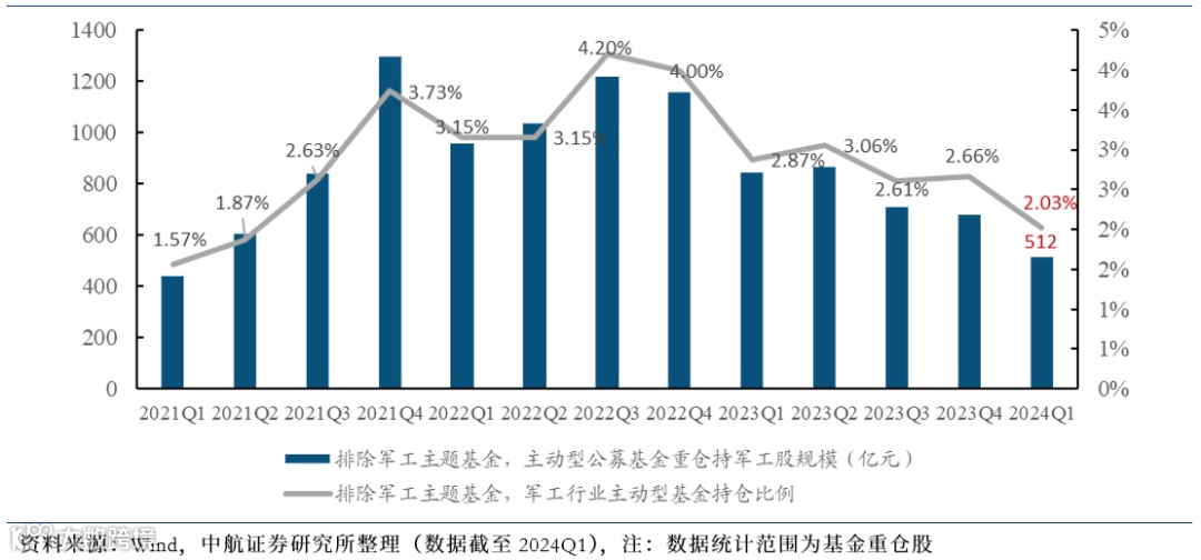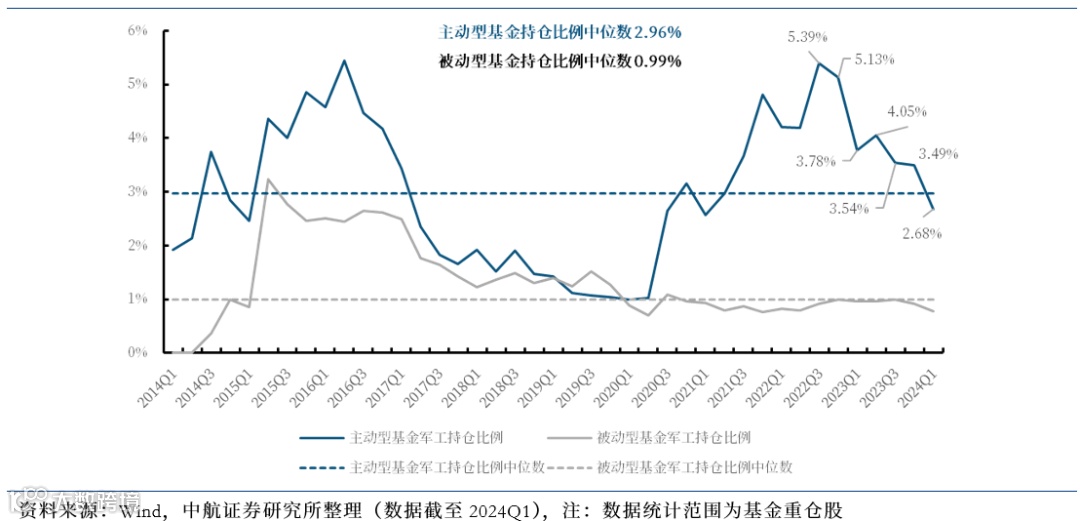 图14 2024Q1主动型、被动型基金军工持仓比例环比下降