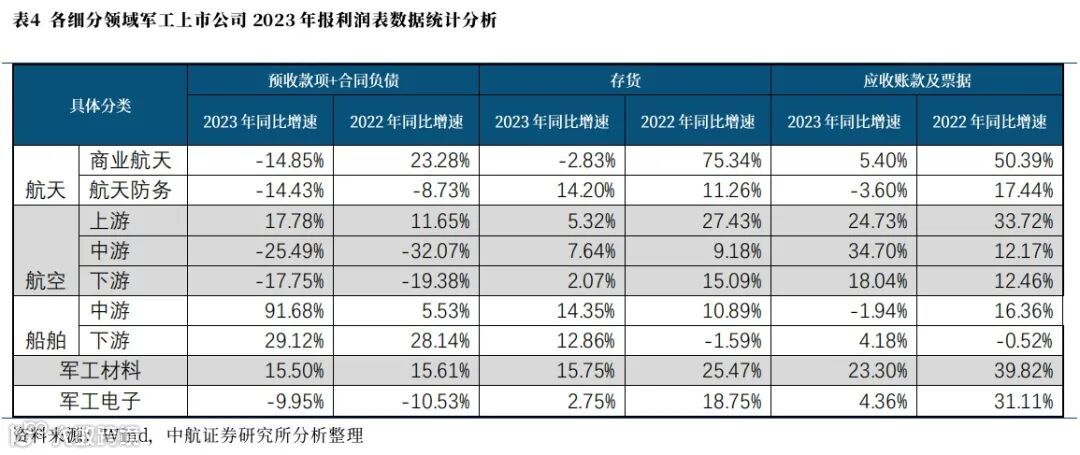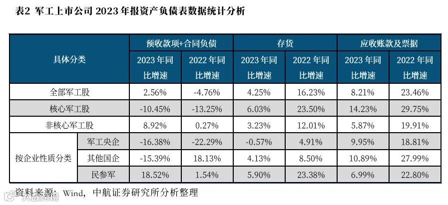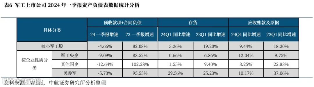 通过分析具有数据可比性的核心军工上市公司一季度报的资产负债表统计,相关数据显示24Q1同样也维持了2023年年报的表现,即: