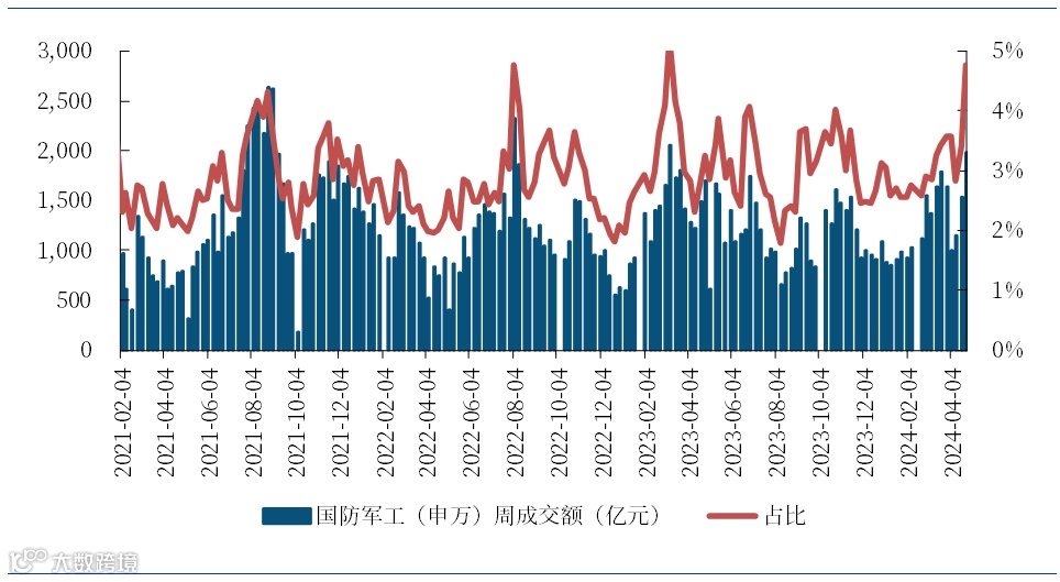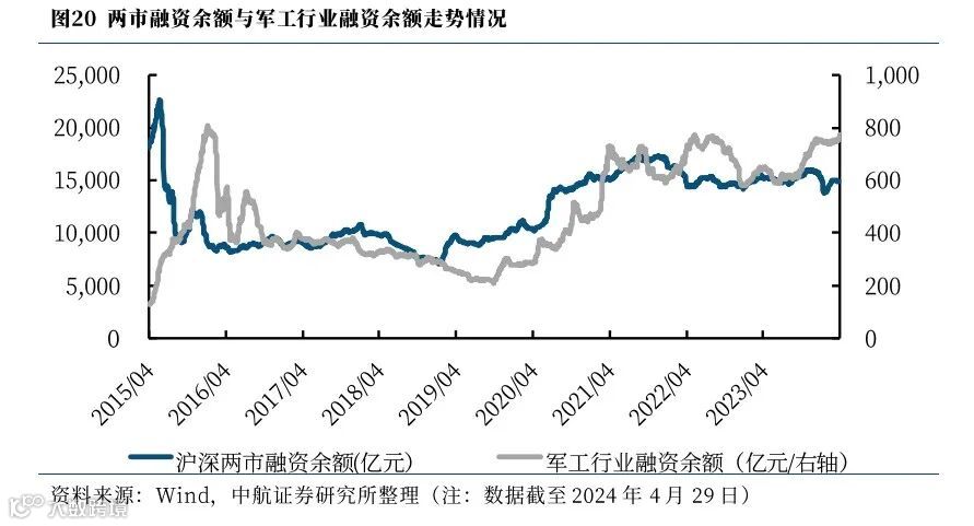 截至2024年4月29日,军工行业的融资余额合计771.06亿元,比上周环比上升2.20%,占两市融资余额比例为5.19%。