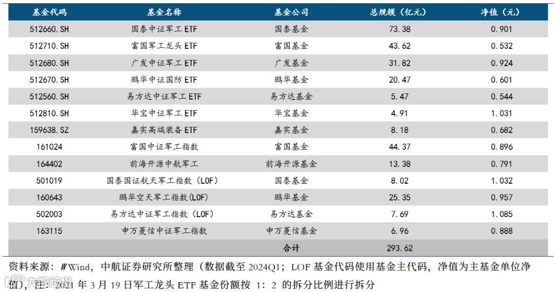 截至2024Q1,军工行业被动类型基金合计规模为293.62亿元(环比下降16.33%)。
