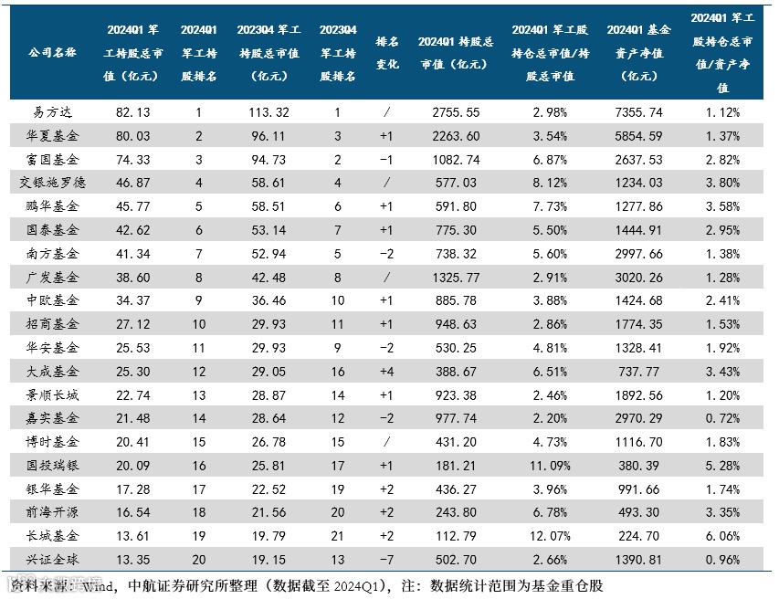 按军工持仓规模(重仓股)排名,公募基金前二十名分别为易方达、华夏基金、富国基金、交银施罗德、鹏华基金、国泰基金、南方基金、广发基金、中欧基金、招商基金、华安基金、大成基金、景顺长城、嘉实基金、博时基金、国投瑞银、银华基金、前海开源、长城基金、兴证全球。