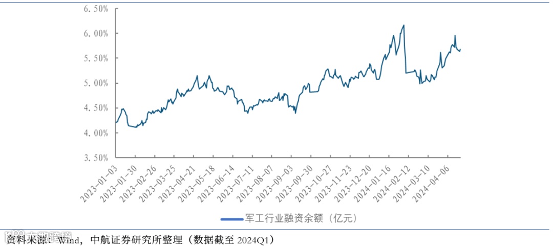 截至2024年4月23日,军工行业融资余额为764.58亿元(相比2023Q4下降0.27%)。融资余额占流通市值比例为5.68%(相比2023Q4上升0.59pcts)。