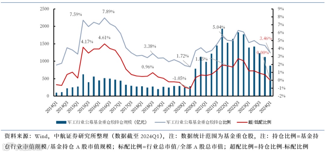 2024Q1公募基金持仓规模大幅下降,在全行业排名也有所下滑。截至2024Q1,公募基金军工持仓规模(重仓)为874.87亿元(环比下降22.18%),位列11/31,较2023Q4下降五位;军工持仓比例为3.46%(环比下降0.95pcts),配置比例基本与行业标配持平。其中,主动型基金持仓比例为2.68%(环比下降0.81pcts),较近年高点2022年 5.39%减半,被动型基金持仓比例为0.78%(环比下降0.14pcts)。