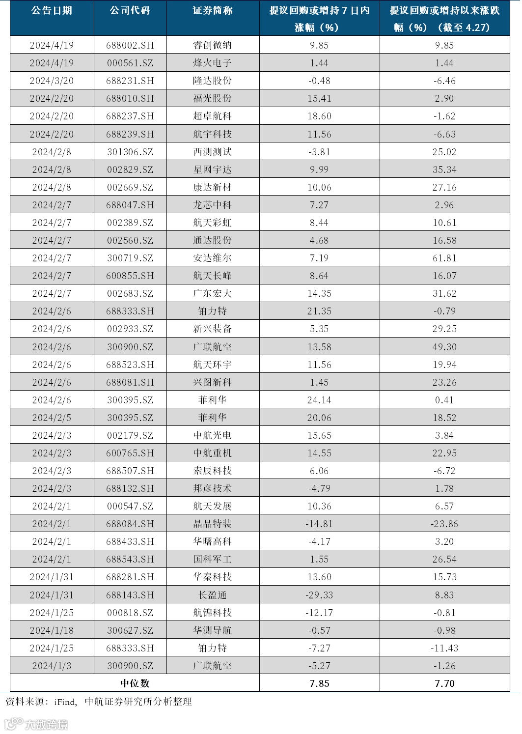 2024年以来,30多家军工板块上市公司密集开展增持、回购等活动。资本市场中,军工行业与其他行业相比,具有保密要求高、可追踪指标相对较少、处于相对不透明状态的特点,导致行业的可研性相对较差,尤其是在“弱现实、弱预期”的情况下,导致相关个股波动加强。在这种情况下,上市公司股东的增持、回购行为一定程度凸显了对公司未来发展的信心,也是公司内在价值与市场价值平衡的重要表现。经统计发现,70%以上的公司在发布回购或增持计划后的7日内,股价均实现了一定程度的上涨。