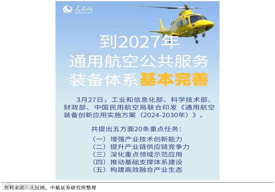 有政策:顶层发声,自上而下支持力度不断超预期。由工业和信息化部、科学技术部、财政部、中国民用航空局等四部门联合印发《通用航空装备创新应用实施方案(2024-2030年)》,发布通用航空产业未来发展纲领性文件,同时国家发改委提出积极推动低空经济发展,顶层的重点关注让低空经济产业发展具备了充足的动能。