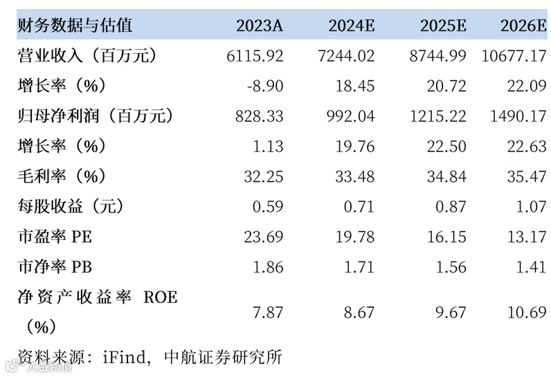 基于以上观点,我们预计公司2024-2026年的营业收入分别为72.44亿元、87.45亿元和106.77亿元,归母净利润分别为9.92亿元、12.15亿元及14.90亿元,EPS分别为0.71元、0.87元、1.07元。基于公司所处行业地位以及未来的发展前景,我们维持“买入”评级,目标价17.50元/股,对应2024-2026年预测收益的25倍、20倍及16倍。