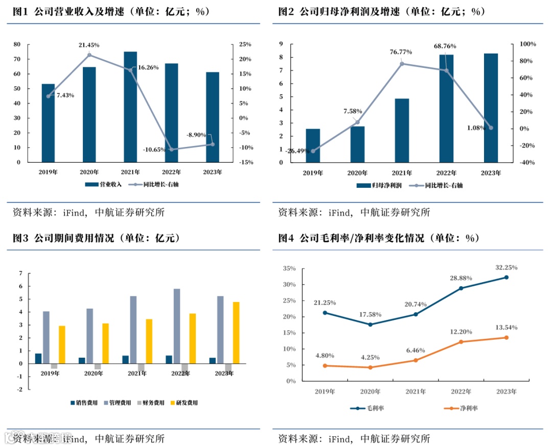 公司4月20日公告,2023年实现营收61.16亿元(-8.90%),归母净利润8.28亿元(+1.08%),扣非归母净利润7.71亿元(-0.56%),毛利率32.25%(+3.38pcts),净利率13.54%(+1.34pcts),基本每股收益0.59元(+1.07%)。