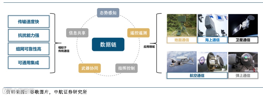数据链是支撑全军通信模式升级的重要底层应用。传统作战指挥以垂直“树叉”式指挥体制为主,层次多、信息传输慢、横向联系少、协同困难、结构抗毁性差。相比之下,数据链具备信息共享、统一态势、战场指挥、武器协同等作用,其广泛应用使得现代指挥体制实现从以“平台”为中心到以“网络”中心的转移,提高了信息共享程度,增强了全军的态势感知及协同作战能力,可覆盖车/舰/星/机/弹等各种武器平台。