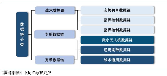 数据链按不同作战应用衍生出丰富品类。按不同作战应用领域,可将数据链分为战术数据链/宽带数据链/专用数据链三种类型,战术数据链可分为态势共享/指挥控制型及综合型,宽带数据链可分为通用宽带数据链、战术通用数据链及微小无人机数据链。
