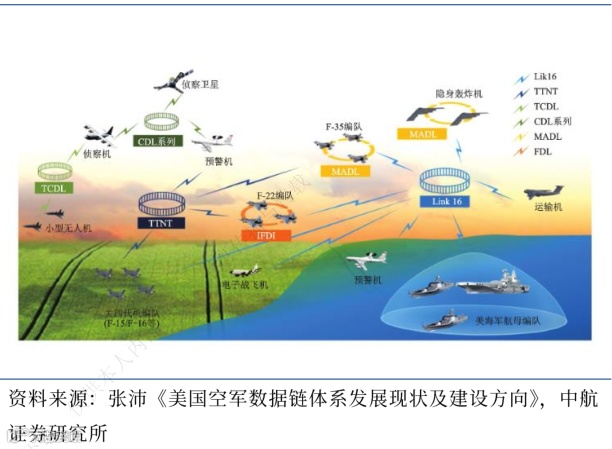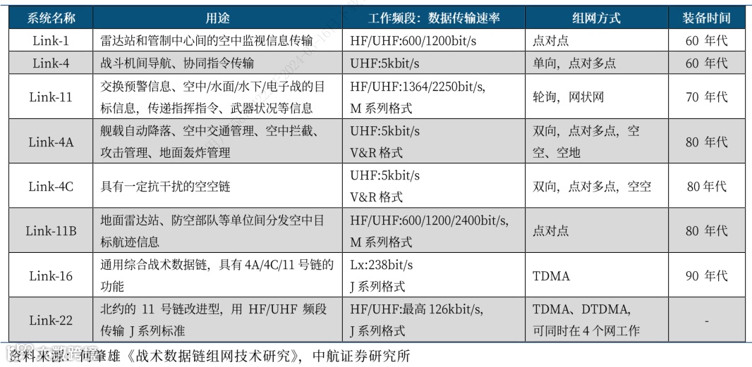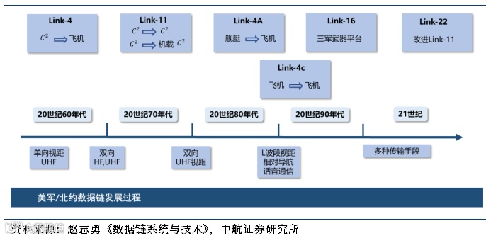 我国数据链发展:起步较迟,持续追赶。根据何肇雄《战术数据链组网技术研究》,我国各军兵种数字化建设起步较迟。由于当年蓝天系统被前苏联视为国土防空的重要武器,拒绝对外提供,所以我国并没有从前苏联得到相关的系统和技术。20世纪60年代,根据国防空作战发展的需要,空军组建了自动化研究所,在学习国外先进CI系统的基础上,探索我国防空自动化系统的概念、体制与技术,并进行早期相关系统的研究。