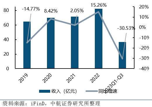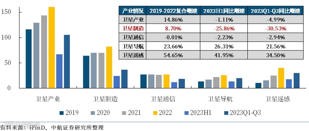 从卫星各细分产业收入增速变化情况来看,2019-2022年卫星制造上市公司收入增速保持平稳增长,2023年前三季度出现阶段性波动。