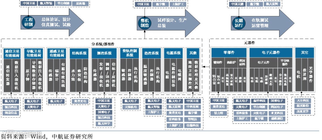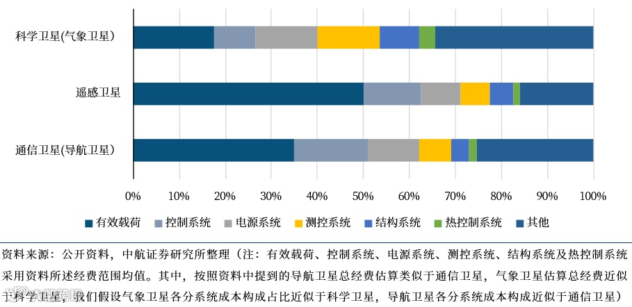 2、关注通信及遥感小卫星在有效载荷、控制系统、电源系统以及测控系统环节上具有低成本及产业化能力的企业,或具有较高技术水平(毛利率较高)、正处于产业化过程中的企业。卫星空间系统的分系统主要由结构系统、热控制系统、电源系统、姿控系统、轨控系统及测控系统构成。如下图所示,各类卫星空间段分系统成本构成中,有效载荷、控制系统、电源系统以及测控系统的成本之和占比均超过50%。在有效载荷、控制系统、电源系统以及测控系统等高价值量领域中,已经具有低成本及产业化能力的企业更有望在卫星制造行业提速之际具有先发优势,而具有较高技术水平(毛利率较高),正处于产业化过程中的企业有望获得相对更高的业绩弹性,消化相对较高的估值。