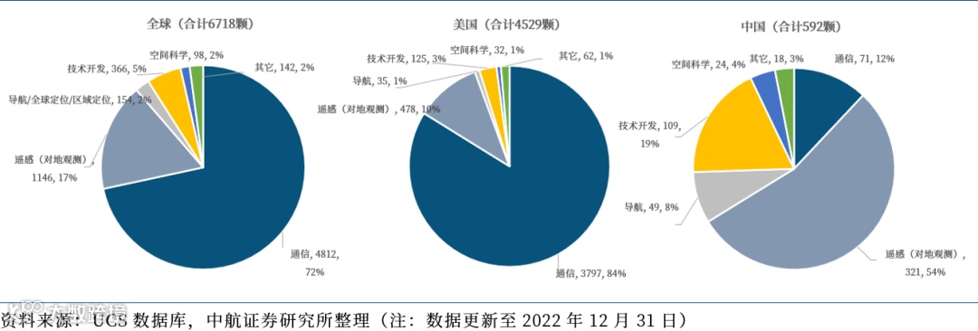 我国在轨卫星仍以遥感卫星为主。根据UCS统计的全球在轨卫星数量,截至2022年12月31日,可以明显发现,近年来随着美国SpaceX公司密集部署Starlink低轨互联网星座计划(“星链”计划),美国在轨卫星中的通信卫星已经达到3797颗,占比超过80%;我国当前在轨卫星仍然以遥感(对地观测)卫星为主,其次是技术开发(验证)卫星。