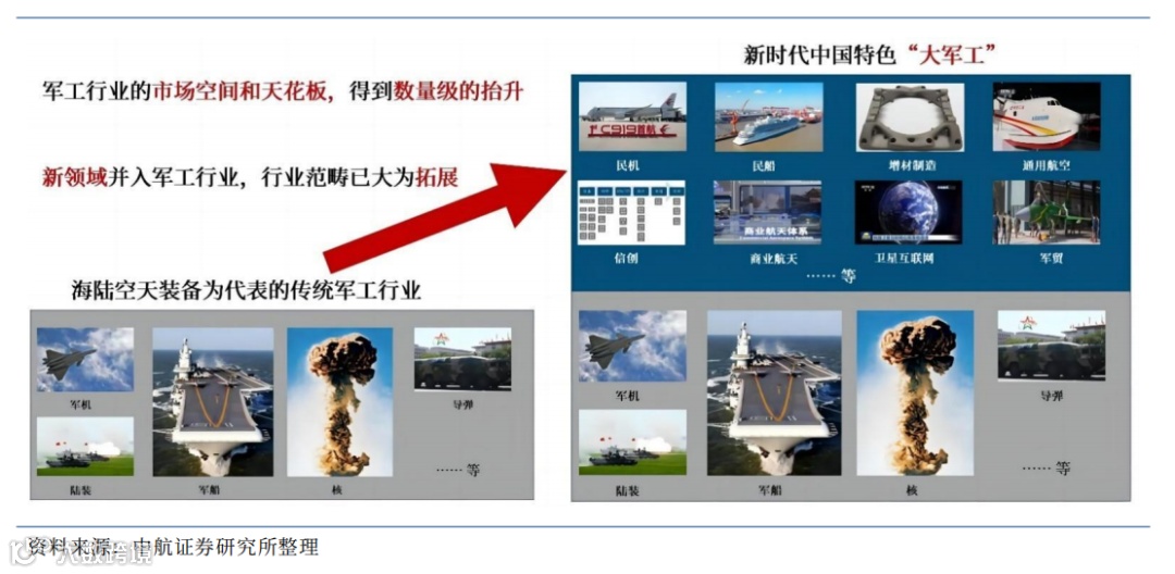 由军机到民机、通航、由军船到民船、由军用卫星到卫星通、导、遥的民用化、由军用火箭到商业航天、由军工材料到增材制造的商用化,新时代的中国特色大军工行业早已脱离了传统武器装备的桎梏,军工行业的市场空间和天花板,已经得到数量级的抬升。