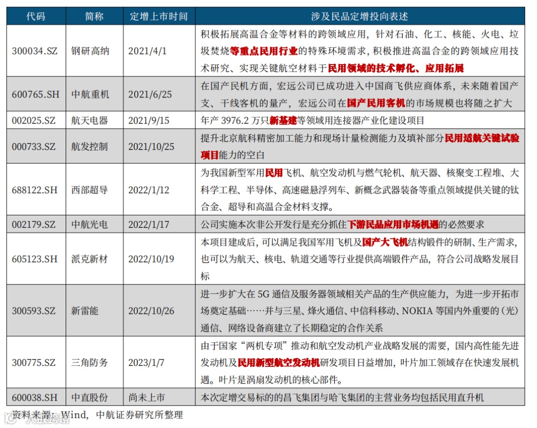 在经历了“十四五”前两年军工快速列装发展,军工企业在技术成熟度、产能建设、成本控制等方面均有了跨越式发展,为“军转民”打好了基础。事实上,在经历从“十三五”末期到“十四五”初期武器装备提质补量、信息化发展与行业国产替代的军工行业高速发展后,核心军工企业也逐步开始向“军转民”领域布局。具体来看,我们统计了2019年以来在定增方案的项目名称、项目必要性分析、项目可行性分析等部分明确表示定增投向包含民品、民用或国产大飞机、新基建、商业航天等表明民品行业的军工核心上市(采用中航证券军工行业核心股票池)企业。可以看到在2021年前鲜有核心军工上市公司定增投向民品方向,而自2021年后,核心军工上市公司的定增募投方向中逐步开始涉及民品领域。