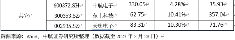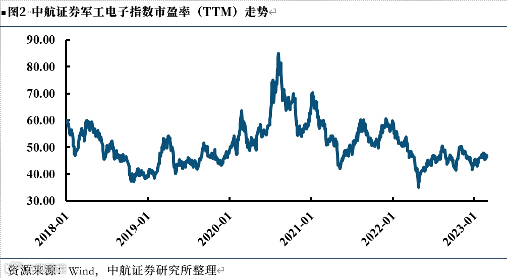 我们对中航证券军工电子指数标的进行PE(TTM)统计,截至2023年2月末指数市盈率为46.56倍,较上月上升0.89%,处于2018年以来的34%分位,相较于航空航天板块,估值仍处于较低水平,配置价值凸显。