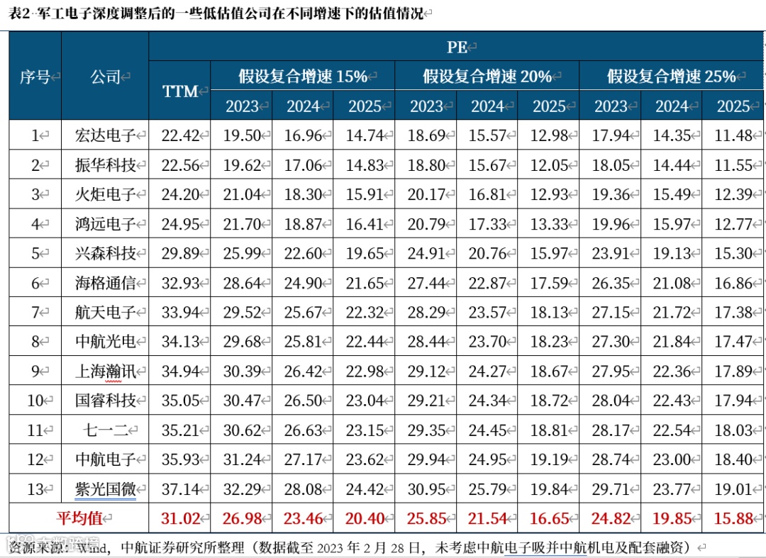 1、深度调整后的低估值标的或可纳入视野。从军工电子相关标的来看,被动元器件及集成电路板块等部分个股已经经过了较长时间、较大幅度的调整,振华科技、紫光国微等核心标的估值均处于历史较低分位,或许市场对于行业未来的增速、竞争格局、订单有怀疑,但我们认为在当前军工装备对军工信息化需求持续增长的大趋势下,军工电子部分领域的不确定性不会维持较长时间,对于当前估值30倍左右的军工电子公司,未来CAGR为20%时,在25年估值基本仅有十几倍,现在或可纳入视野。
