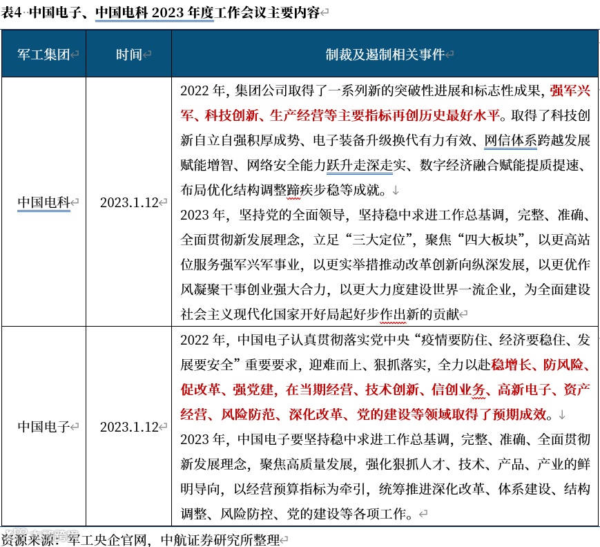 2023年1月,中国电子及中国电科召开了2023年年度工作计划会,作为军工电子的主力军,两大集团企业2022年保持了较好的发展态势,尤其是中国电科,在生产经营等主要指标再创历史最好水平,其经营情况对军工电子产业整体景气度具有指引意义。