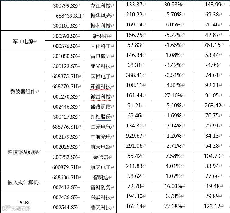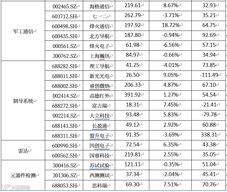 紫光国微(特种芯片);大立科技(红外制导);长盈通(惯性制导);新雷能(军工电源);雷电微力、国博电子(TR组件);振华科技(军工电子元器件);火炬电子、鸿远电子、宏达电子(高端电容);智明达(嵌入式计算机);中国软件、中国长城(信创);国睿科技(雷达整机)。