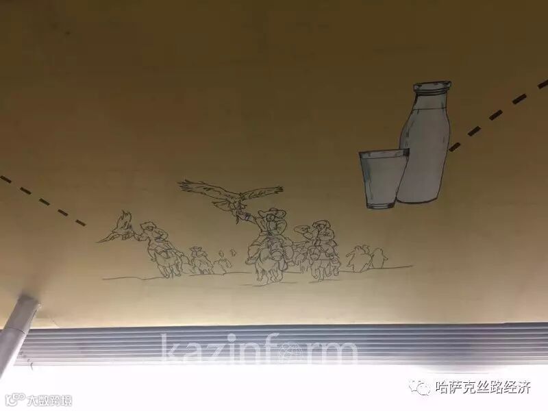 哈萨克斯坦主题车厢和影像展印有哈萨克传统绣花、哈萨克毡房、捕猎的雄鹰、"Nur Astana"清真寺和哈萨克名人画像。
