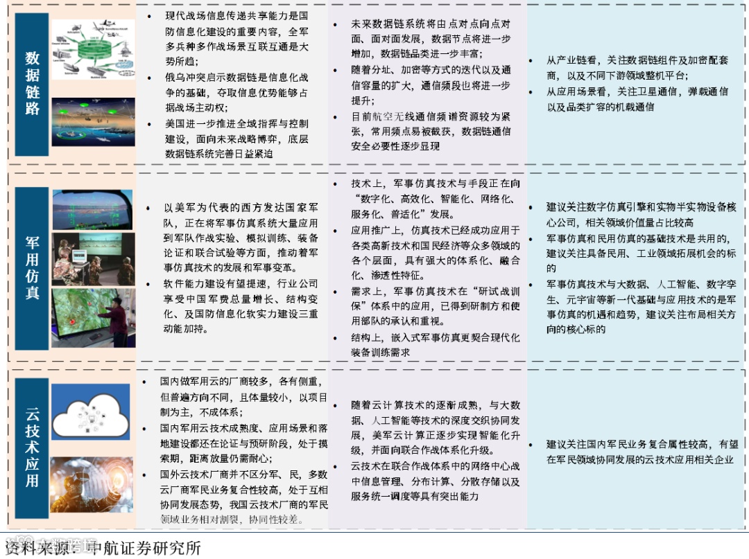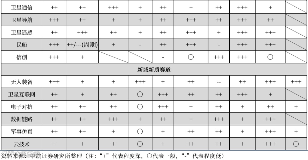③ 新域新质赛道:主要包含以无人装备、卫星互联网、电子对抗、数据链路、军事仿真以及云技术等新战争形态下,以“智能化、体系化、信息化”为代表的军工细分领域,这些领域往往已经受到海外军事强国的重视或已经在战场上得到了实战验证,在国内往往处于早期萌芽发展阶段,但应用发展确定性相对较强。新域新质各细分领域在“十四五”末,乃至“十五五”时期都有望具有较大发展弹性,将有望成为军工板块在未来中长期持续高景气发展的新驱动力。